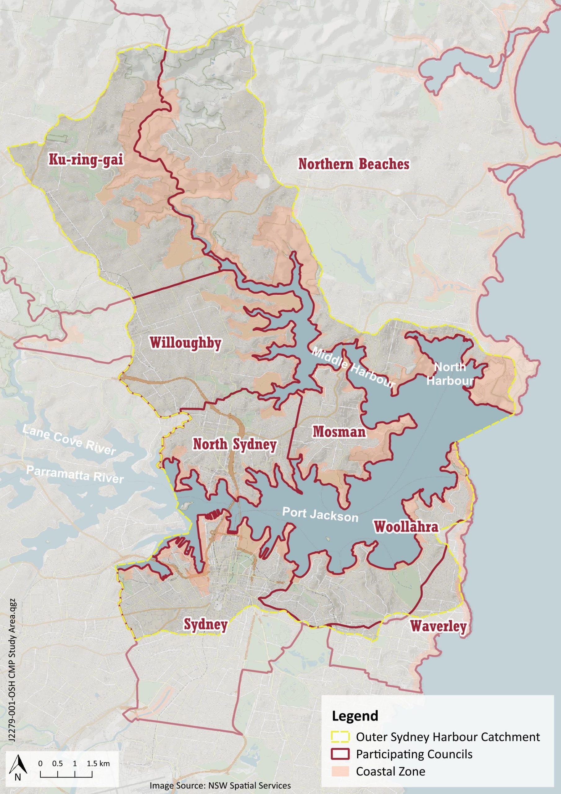 Sydney Harbour can be divided into the inner harbour comprising Parramatta River and Lane Cove River to the west, and the outer harbour extending eastwards from the confluence of the Parramatta River and Lane Cove River to encompass Port Jackson, Middle Harbour and North Harbour. The study area for the Outer Sydney Harbour CMP encompasses the coastal use area and areas that drain to the harbour within the local government areas (LGAs) of City of Sydney, Ku-ring-gai, Mosman, North Sydney, Northern Beaches, Willoughby and Woollahra, Sydney Harbour National Park, including harbour islands, and Garigal National Park, and Sydney Water’s area of operations.